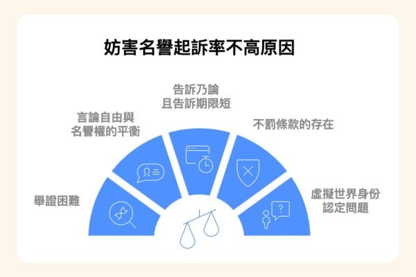 妨害名譽屬於告訴乃論,需由被害人主動提起告訴,警方才能介入偵辦,因此被害人若沒有主動向警方或檢察官提起,便無法提起告訴;此外,由於告訴期只有6個月,許多告訴人常因訴訟程序繁瑣冗長,或是害怕加害人報復而放棄提告。