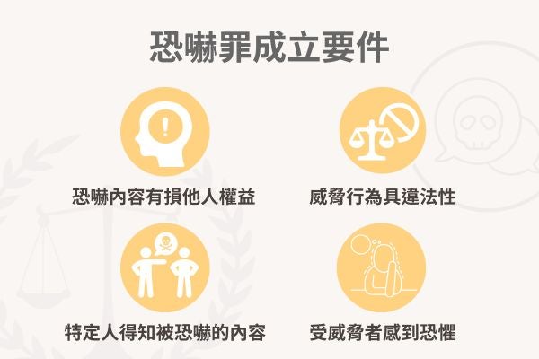 - 恐嚇內容有損他人權益:恐嚇內容的言詞不見得需特別具體(例如:會給某人一點教訓),只要有損害他人生命、身體、自由、名譽或財產...等個人權益或行動自由,恐嚇罪便成立。