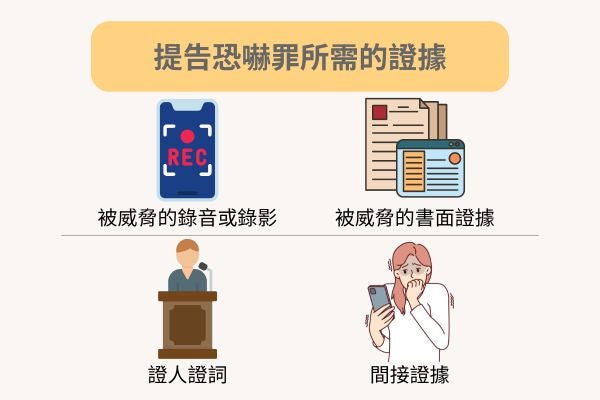要提告恐嚇罪,受害者應盡可能提供以下證據以支持指控: