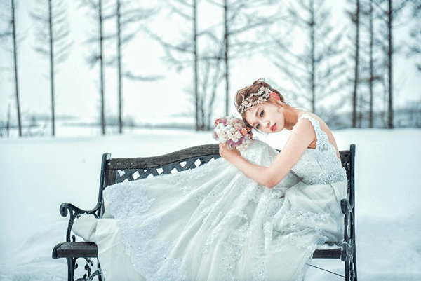 ▲在被白雪覆蓋的皚皚世界中,新娘身穿純白的婚紗,形成一幅和諧的景緻。