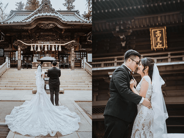 ▲新郎新娘佇立於莊嚴的神社前,氛圍靜謐且浪漫。
