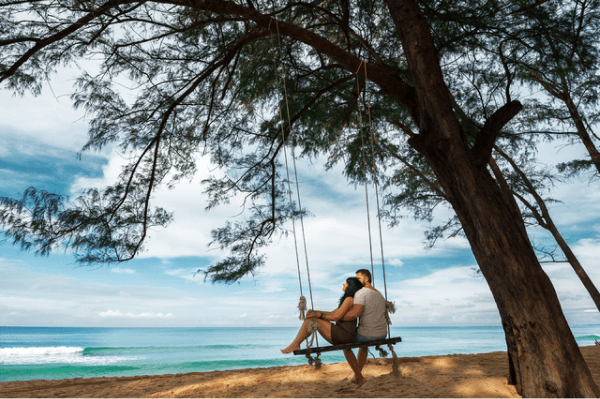 ▲情侶在海灘鞦韆上依偎而坐,呈現新人悠閒又自然的一面。