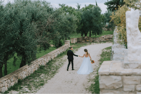 ▲新人手牽手漫步在石牆與樹林包圍的小徑,構圖使整個畫面蘊含無限的故事感與對未來的期許。