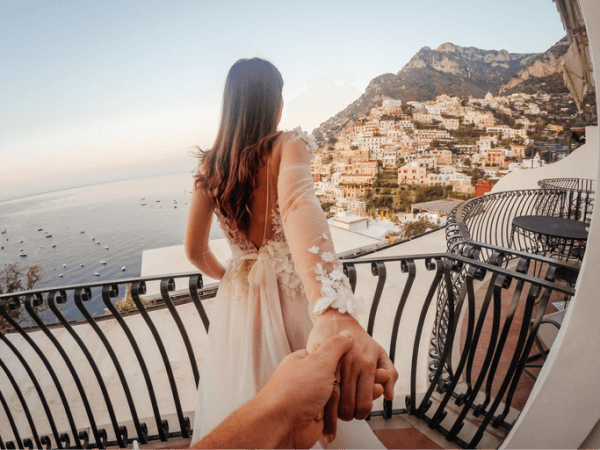 ▲五彩斑斕的城鎮錯落在山間,與無際的蔚藍海岸相映成趣,新人可以在陽台上的海景視角,拍攝浪漫的牽手或背影照片。
