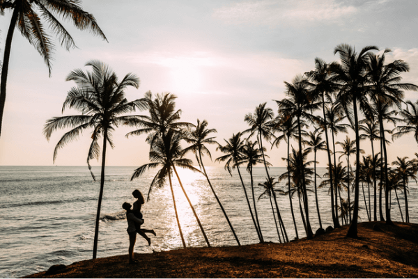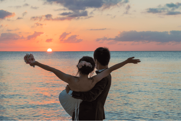 ▲夕陽下的海岸,新郎將新娘高高舉起的剪影,構成經典又浪漫的畫面。