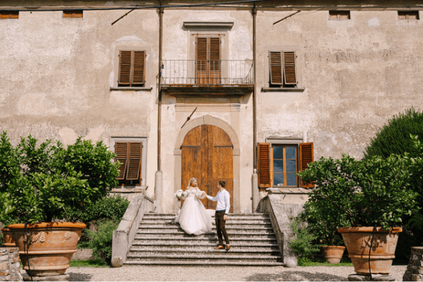 ▲復古石牆與兩旁鬱鬱蔥蔥的盆景構成義式田園的標誌性畫面,新人在階梯上互動,頗富歐洲莊園的浪漫風情。