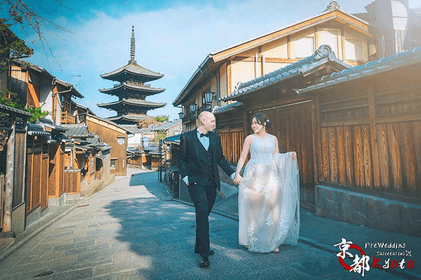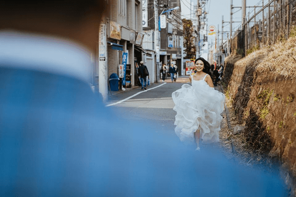 ▲穿著白紗的新娘奔向新郎,背景是樸實的日本街景,紀錄屬於兩人的甜蜜故事。