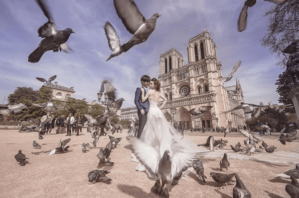 ▲新人在巴黎聖母院廣場前相擁,鴿群振翅飛起,讓鏡頭將歷史與愛情同時定格。