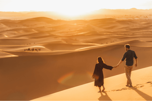 ▲成排沙丘在夕陽下起伏,新人牽手走在橙色餘暉下,別具異域風情。
