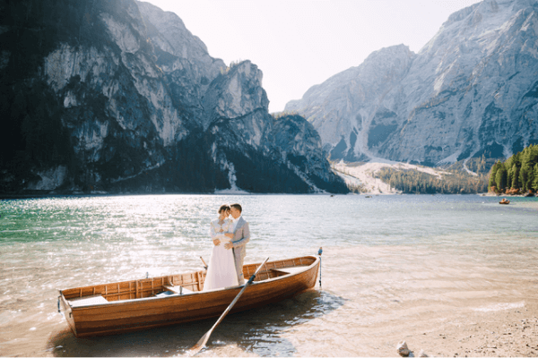▲清澈的湖面倒映著巍峨的群山,新人可在船上合影,拍攝靜謐又充滿詩意的照片。