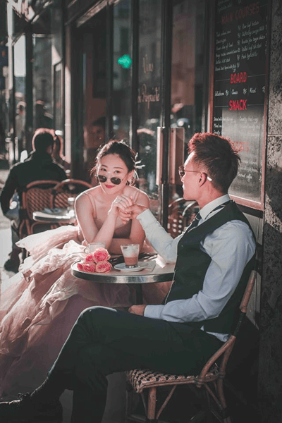 ▲新人於街角咖啡館的露天座位悠閒互動,展現巴黎人獨有的生活情致。