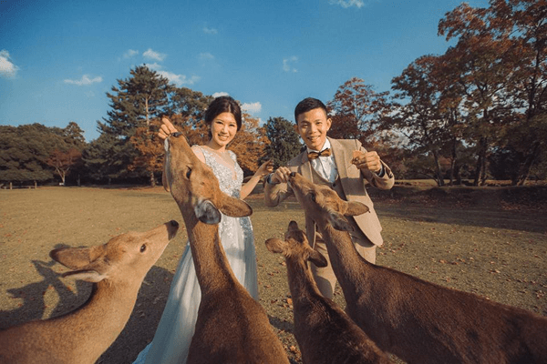 ▲溫暖的午後,新人與鹿群嬉戲,營造活潑又具自然感的婚紗照。