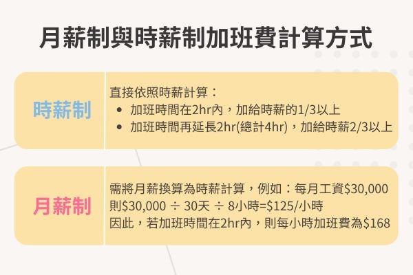 例如:勞工月薪為$30,000,則$30,000 ÷ 30天 ÷ 8小時=$125/小時,若勞工除正常工作時間外,加班4小時,則加班前2小時的加班費為$125 x 1.34 x 2 = $335;加班後2小時的加班費為$125 x 1.67 x 2 = $417.5。