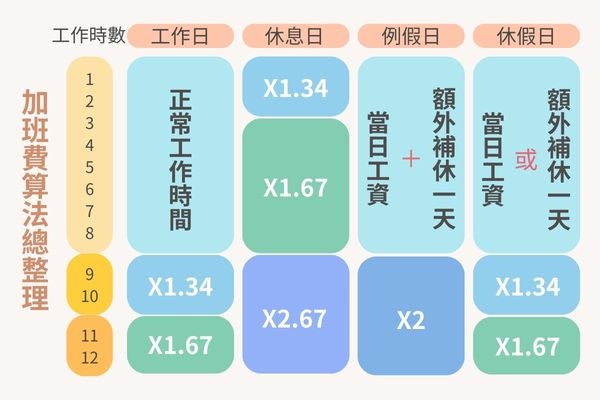 - 加班再2小時(第11-12小時),需按平日每小時工資加給2/3(約1.67倍)以上。
