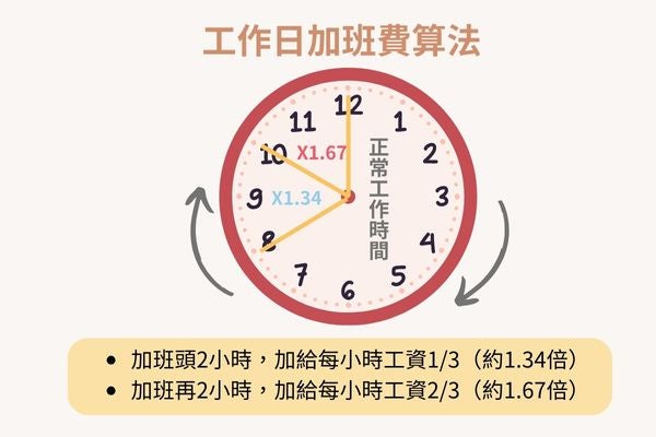- 工作時間在2小時內(第1-2小時),需按平日每小時工資加給1/3以上(約1.34倍)。