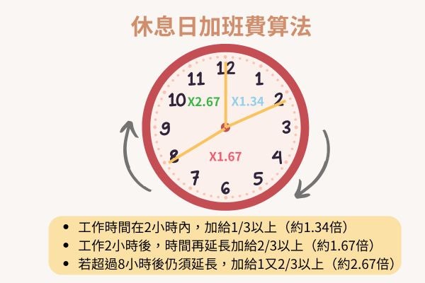- 工作2小時後,時間再延長(第3-8小時),需按平日每小時工資加給2/3以上(約1.67倍)。