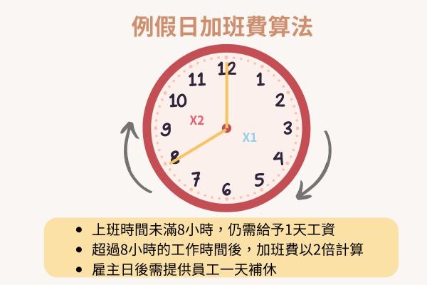 - 例假日上班時間(第1-8小時)內,即便未滿8小時,雇主仍需給予1天工資。