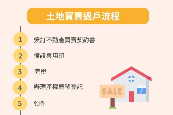 土地買賣主要分為「簽訂不動產買賣契約書」、「備證與用印」、「完稅」、「辦理產權轉移登記」及「領件」五步驟,以下為您詳細說明: