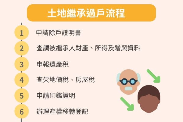 土地繼承過戶過程主要分為「申請除戶證明書」、「查調被繼承人財產、所得及贈與資料」、「申報遺產稅」、「查欠地價稅、房屋稅」、「申請印鑑證明」及「辦理產權移轉登記」六步驟,以下為您詳細說明: