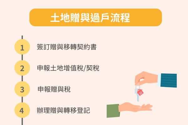 土地贈與過戶過程主要分為「簽訂贈與移轉契約書」、「申報土地增值稅/契稅」、「申報贈與稅」、「辦理贈與轉移登記」四步驟,以下為您詳細說明: