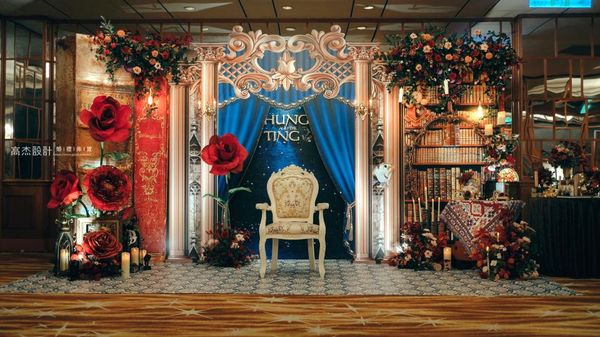 充滿歐式宮廷風格的設計,搭配紅玫瑰和書架,適合用於婚禮或正式的慶祝場合,彰顯高雅華麗的氛圍,為活動增添貴族氣息。
