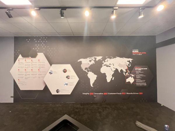 以黑色為基調,結合企業發展歷程與世界地圖,適合各類商品展覽、商業展覽、企業年會等官方活動,讓參加者一眼了解企業的全球影響力。