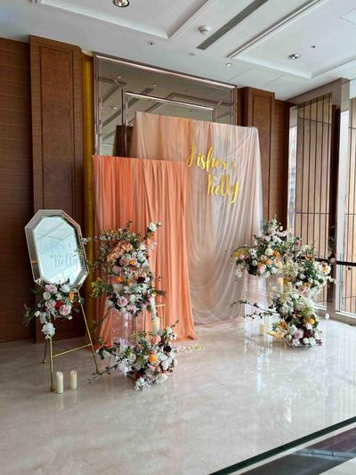 柔和的橙色與粉色花藝布置,搭配典雅的布簾,是婚禮或求婚場合的完美選擇,能營造出浪漫與溫馨的氛圍,讓現場每一刻都充滿愛意。
