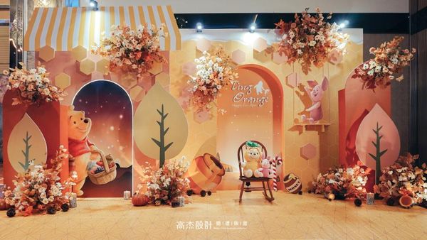 背板以小熊維尼和粉紅小豬為主角,搭配柔和的橙色與蜂巢造型,非常適合兒童主題派對,給人一種溫暖又充滿童話色彩的感受。