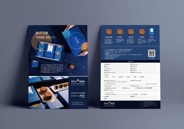 潮宇月餅禮盒設計以深藍和金色為主色調,搭配優雅的排版,完美地呈現了中秋佳節的氛圍,而為了推廣月餅禮盒,訂購單的文宣設計清楚展示不同口味的月餅以及其內容物,還有完整的禮盒外觀圖示及明確的訂購填單格式,不僅能夠激發消費者的購買欲望,也讓消費者方便快速的完成訂購流程。