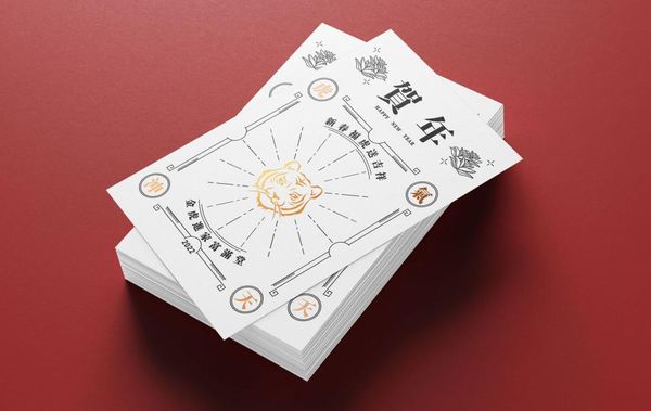 賀年卡片是節日期間增強品牌曝光的有效方式之一。虎年賀年卡片設計採用簡約的風格,以大字「賀年」的標題搭配虎年的象徵元素,使祝福意圖更加清晰明了。這樣的設計既具時代感,又能增強品牌在節日期間的知名度,讓消費者對品牌產生好感。