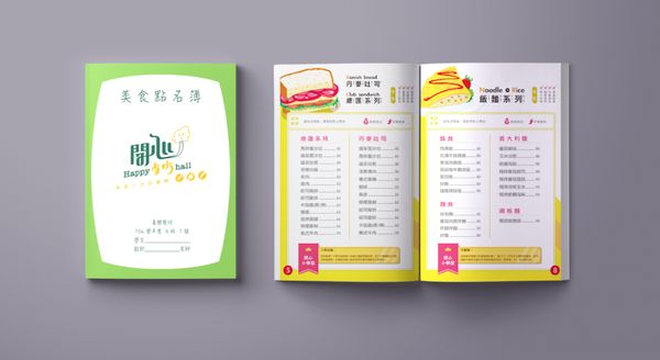 餐廳的菜單設計特殊,除了供顧客點餐用還能作為廣告文宣,為品牌提高品牌知名度、推廣餐點品項。開心點名簿的菜單設計以清新亮麗的色彩和整齊的排版吸引顧客的注意,並營造出愉悅的用餐氛圍。這樣的設計不僅能提升顧客的用餐體驗,還能加深他們對餐廳品牌的印象。