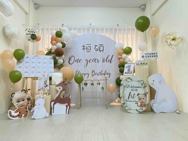 可愛的動物卡通造型搭配綠色與橙色的氣球,營造出如同置身森林的溫馨場景,非常適合幼兒生日派對,給孩子們帶來無限驚喜。