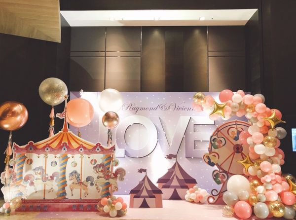 浪漫的旋轉木馬與摩天輪背板款式搭配柔和的氣球拱門,為婚禮增添了童話般的浪漫氛圍,讓在拍照背板前迎賓、送客時拍照的新人和賓客都仿佛置身於童話世界。