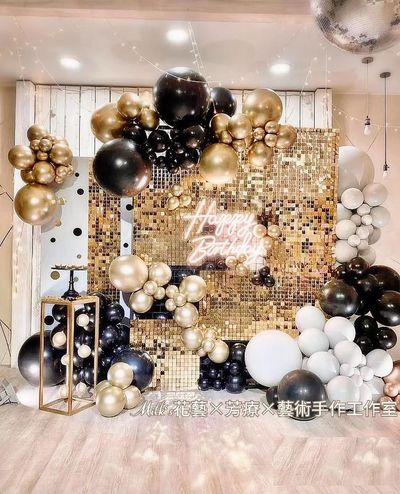 利用金色亮片牆與黑金氣球組合,創造出高貴且閃耀的派對背景,適合生日或特殊場合的慶祝,突顯派對的華麗感。