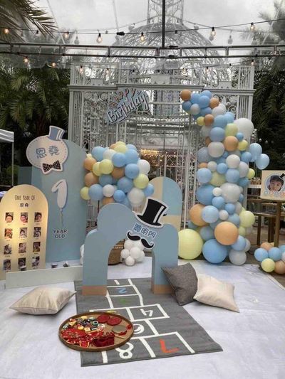 以粉藍、粉黃的合成板為主搭配氣球和可愛裝飾,打造清新自然的氛圍,適合戶外兒童生日派對,充滿溫馨和歡樂。