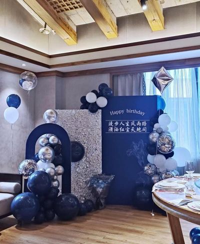 以深藍與亮銀為底的背板款式,搭配銀色和藍色的氣球與裝飾,呈現出星光般夢幻的氛圍,設計既浪漫又充滿現代感,能讓場地充滿神秘和優雅的氛圍,適合喜愛宇宙、星空等主題的壽星舉辦小型慶祝活動或晚宴。