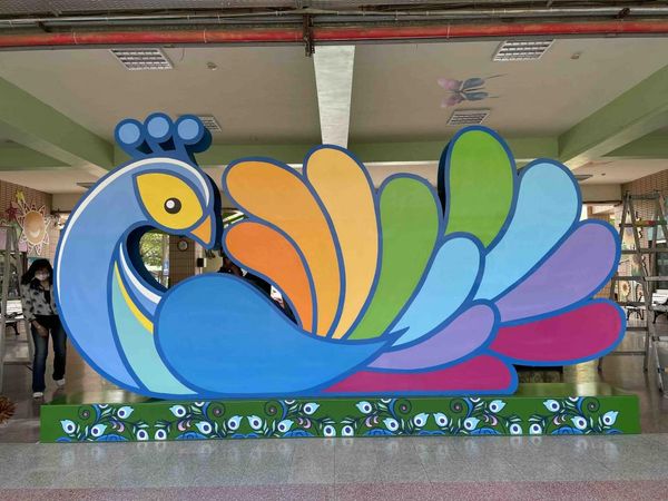 色彩豐富的孔雀造型背板,適合作為活動背板,增添活動現場的亮點。鮮豔的色彩和生動的造型使背板成為活動的焦點,吸引眾多參加者合影留念,同時也為活動增添了活力和趣味性。