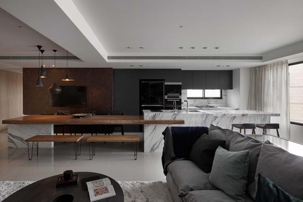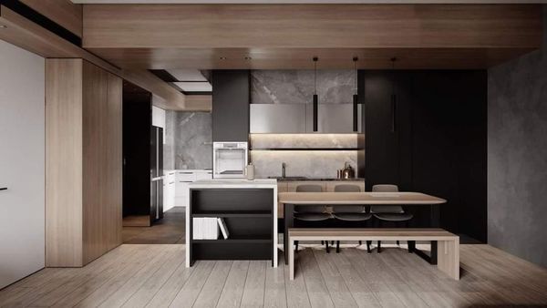 深色的廚房容易顯得壓迫,因此可以選擇在檯面、櫃體貼皮或地板使用木質建材,透過溫潤質感中和黑色的冷調,不僅能使廚房看起來更為溫暖和宜人,還夠讓整個空間充滿自然的暖意,讓人感受到家的舒適;除了木材,大理石與布質裝飾也能讓空間變得更為豐富,有助於提升整體的美感和層次。