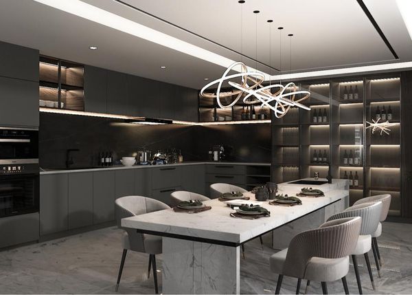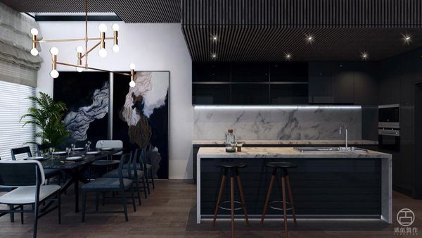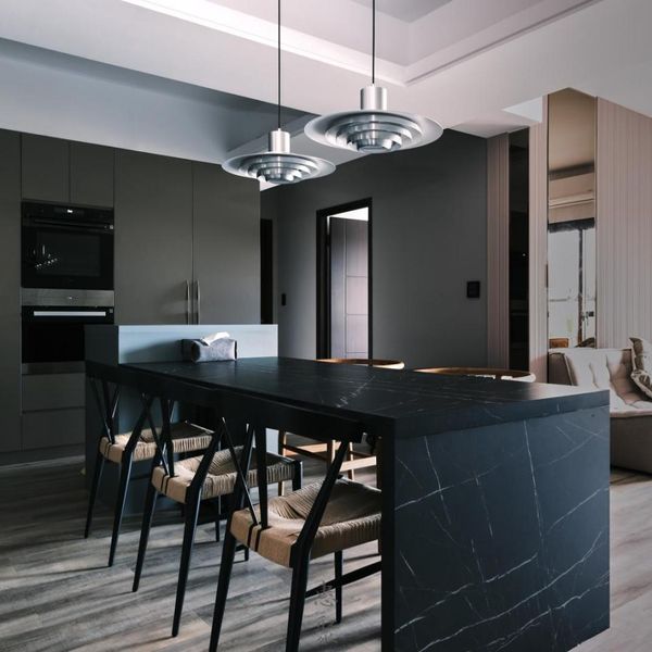 想要打造高雅的黑色廚房,細節的處理至關重要。黑色檯面搭配金屬元素可以在黑色背景下呈現出閃耀的對比效果,強化廚房的高端感,提升整體的質感;除了金屬元素,您也可以選擇簡約風格的吊燈不僅能夠提供良好的照明,還能成為黑色廚房的點睛之筆,使整體設計更加協調。