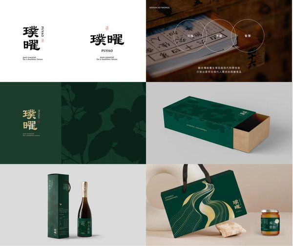 圖中的產品包裝設計結合中草藥文化和現代風格,深綠色與流暢的圖案線條強調企業的健康理念和未來感。