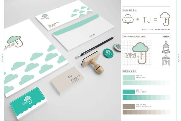 範例除了應用系統,也有展示基本系統設計,以柔和的綠色和雲朵圖案,傳遞自然和溫和的企業形象,展現友善與活潑的設計風格,適合與家庭和日常生活相關的品牌。