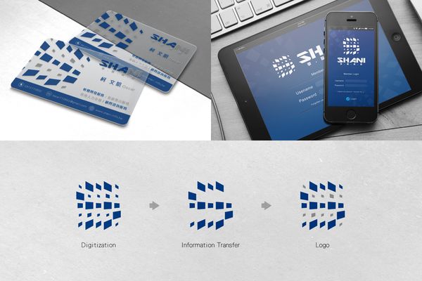 展示Logo設計理念,以及應用於名片設計、網站設計等應用系統設計的構想,品牌設計以數位化轉移為主題,幾何圖形象徵數據傳輸過程,強調科技感和現代化的品牌核心價值,適合科技行業。