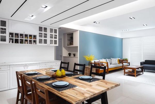 在另一案例中,設計師使用自然木紋餐桌搭配與藍色主牆,加上藤編邊櫃與明亮的照明設計,營造出融合英式鄉村與現代元素的溫馨開放式餐廳。空間設計呼應自然素材,搭配淺色木紋地板與懸掛式燈飾,展現出質樸又富層次感的英倫居家氛圍,讓家庭用餐更具儀式感與情感溫度。
