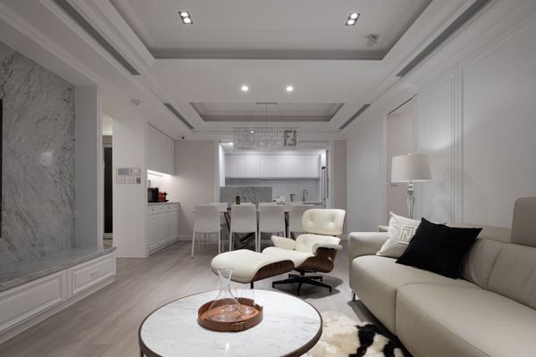 以下案例中,設計師在客廳空間運用了層次分明的白色天花設計與大理石主牆,展現出乾淨俐落的視覺線條。天花上的雕刻層次呼應下方空間的對稱擺設,搭配優雅水晶吊燈與有深色木紋點綴的家具,營造出典雅與現代並存的氛圍。