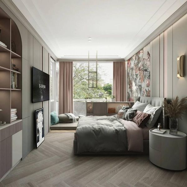 在以下案例中,臥室結合花卉壁紙與自然光,融入粉綠配色與植栽點綴,使空間多了一份療癒的自然氣息。搭配柔和窗簾與胡桃木家具,整體呈現出彷彿置身英式花園般的舒適感受,讓人每一次醒來都心情愉悅。
