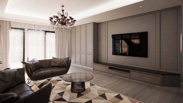 另一案例中,牆面採用低彩度灰色為主色調,搭配細緻線板與微光金屬飾條,呈現出成熟穩重的視覺語彙。空間中的深棕皮革沙發和幾何圖騰地毯相互呼應,延續整體的英倫風骨感。一盞古典水晶吊燈垂掛於中央,使整體空間多了一份歷史厚度與藝術層次。