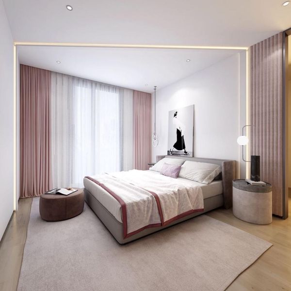 而在以下案例中,臥室空間運用了柔粉色調作為主軸,結合絨布床頭與玫瑰金配件,營造出浪漫而優雅的女性風格,空間中巧妙融入鏡面與金屬細節,讓整體氛圍更顯精緻且富有現代感,而線條照明則柔化了視覺張力,打造舒心宜人的休憩角落。