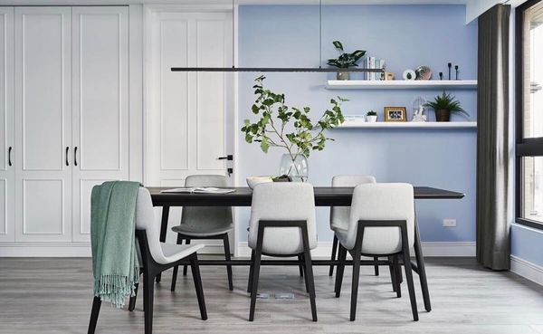 以下案例中,餐廳以藍白色牆面搭配木質家具為基底,透過細腳椅與綠意點綴,呈現輕盈清新的用餐空間,展現現代英倫風的簡約美學。整體空間透過大面積留白與柔和光源相輔相成,使用餐環境不僅舒適宜人,更展現出品味與生活質感的平衡。