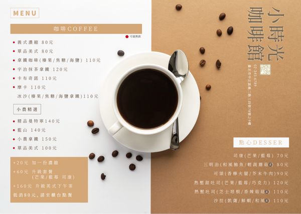 小時光咖啡館菜單採用咖啡杯和咖啡豆等圖像元素,塑造咖啡廳的專業感,同時也傳遞出溫馨感,能夠讓顧客更直觀地認識到品牌的專注與特色。