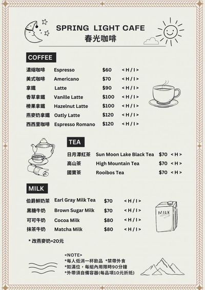 春光咖啡菜單融合手繪太陽和咖啡杯的圖像,傳達品牌的溫暖與活力,讓顧客在細節中感受到品牌的精緻與用心,進而提升對品牌的好感。